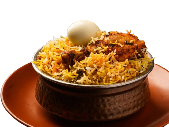 Authentic Hyderabadi chicken biryani made with tender chicken and fragrant saffron rice.