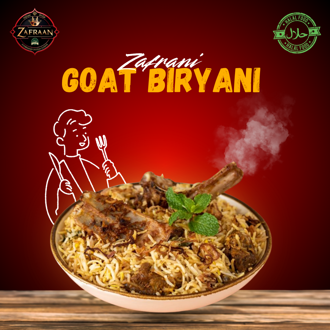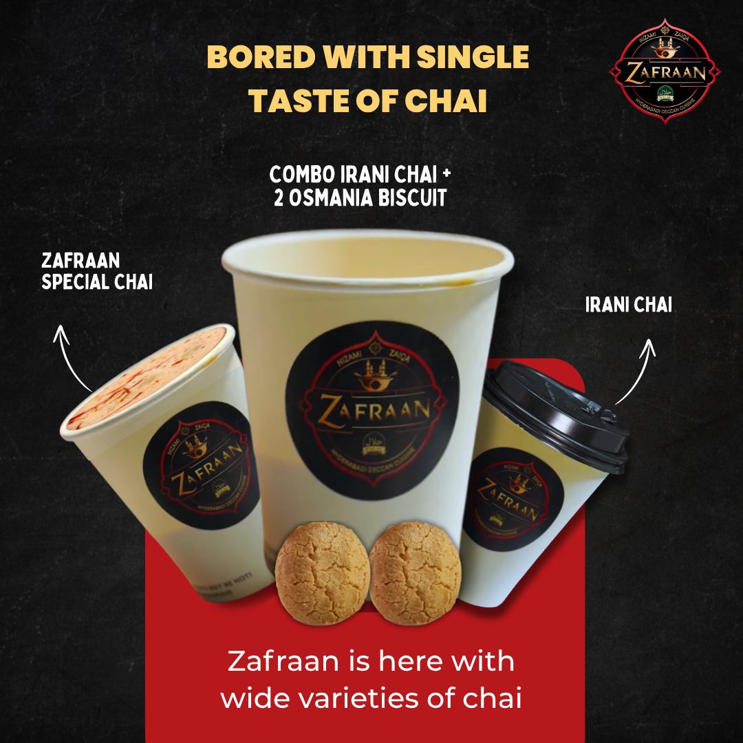 The Zafraan, your go-to Hyderabadi Indian restaurant. From richly spiced curries to authentic street-style favorites, our menu is packed with bold, unforgettable flavors. Savor signature dishes like Mutton Tahari, Goat Biryani, Chicken Biryani, Goat Shawarma, Chicken Shawarma, and our fusion delights like Goat Hulk Shawarma and Goat-Chicken Shawarma. Craving something more? Don’t miss our Chicken 65 with Paratha, Kathori Chat, Matka Fruit Malai, or warm up with our iconic Irani Chai, served solo or as a combo with 2 Osmania biscuits. Try the refreshing Aab Shola for a perfect finish.